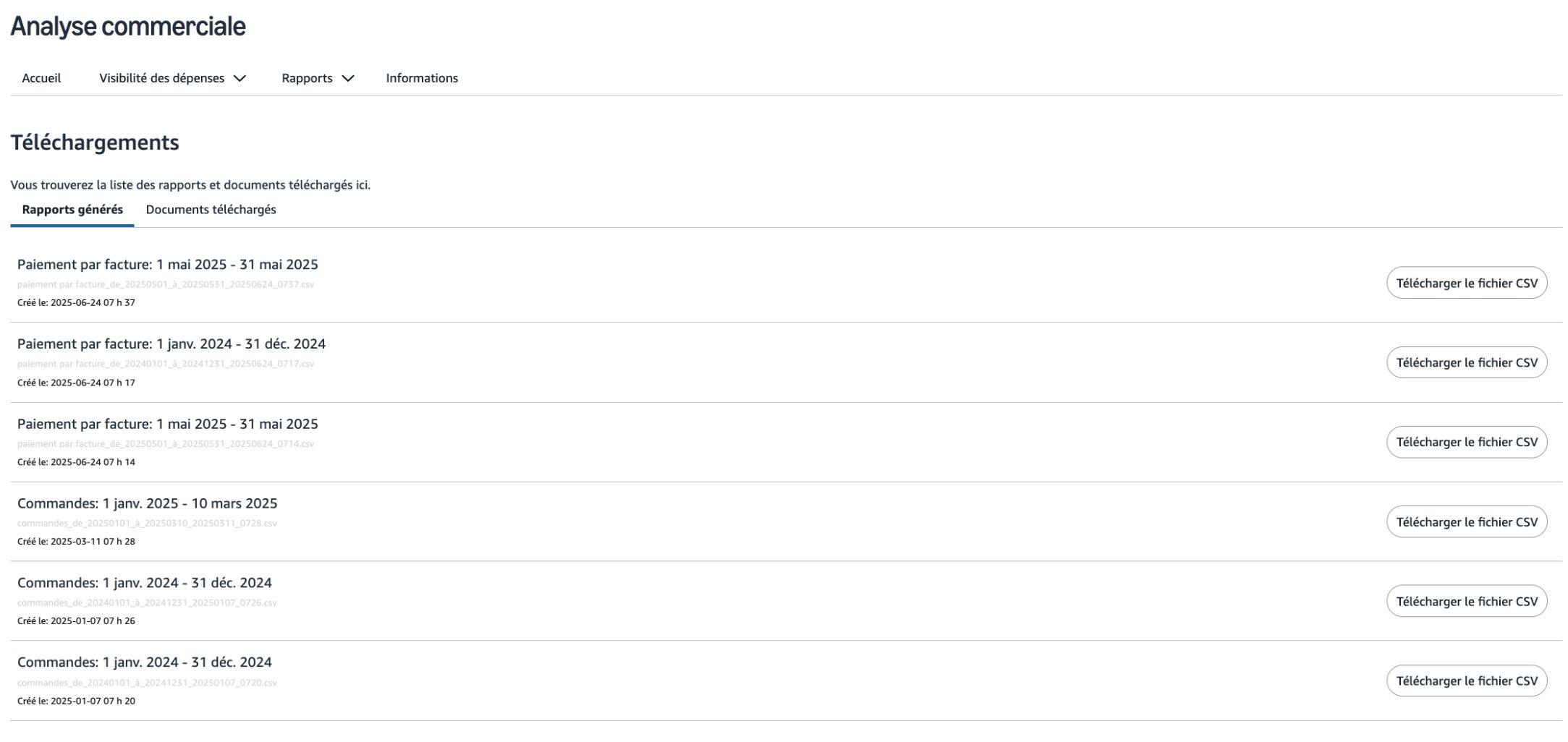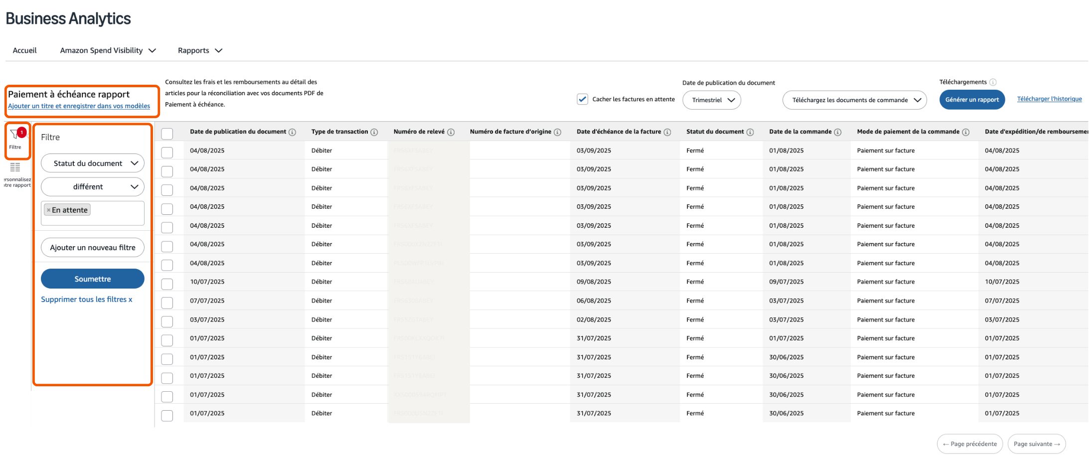 Le rapport de Paiement à échéance fournit des données de facture dans des formats CSV faciles d’utilisation. Ces fichiers faciles d’utilisation incluent tous les détails essentiels dont vous avez besoin pour réconcilier les commandes et faire correspondre les valeurs incluses sur votre facture PDF.