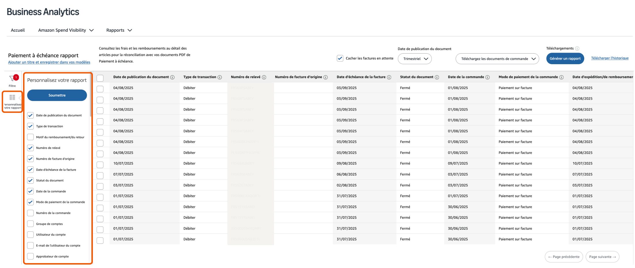 Le rapport de Paiement à échéance d’Amazon Business Analytics est une nouvelle fonctionnalité conçue pour répondre à ces défis courants. Avec des formats faciles d’utilisation et des modèles personnalisables, cette solution de création de rapports simplifiée s’adapte harmonieusement à vos processus et peut vous aider à améliorer la précision, à réduire les erreurs et à gagner du temps.
